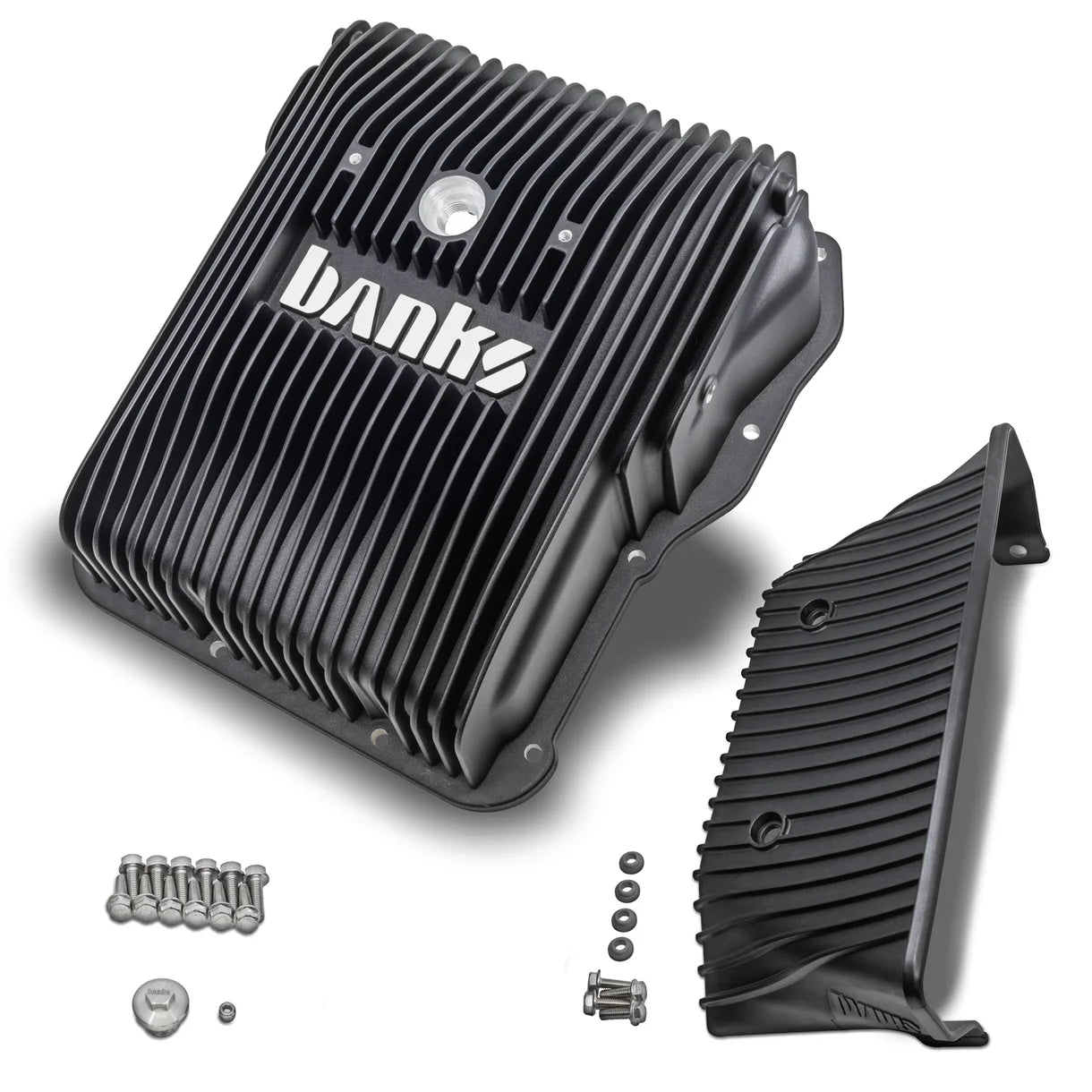 A large forward-facing scoop draws ambient air and channels it through external heat-radiation fins. This pan adds 2 additional quarts of fluid capacity while keeping the lowest point limited to the sacrificial front scoop. The plastic scoop is designed to break away without damaging the pan; contact Banks if it breaks and they’ll provide a replacement scoop.