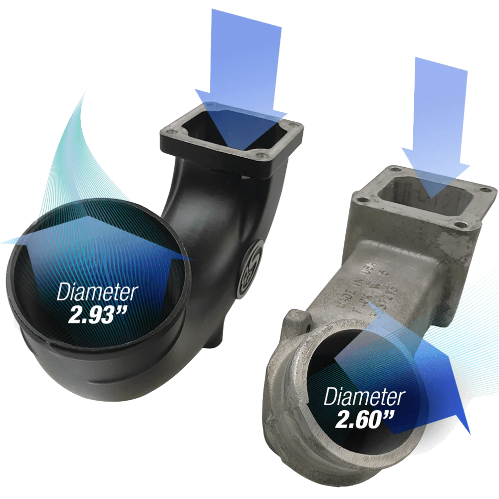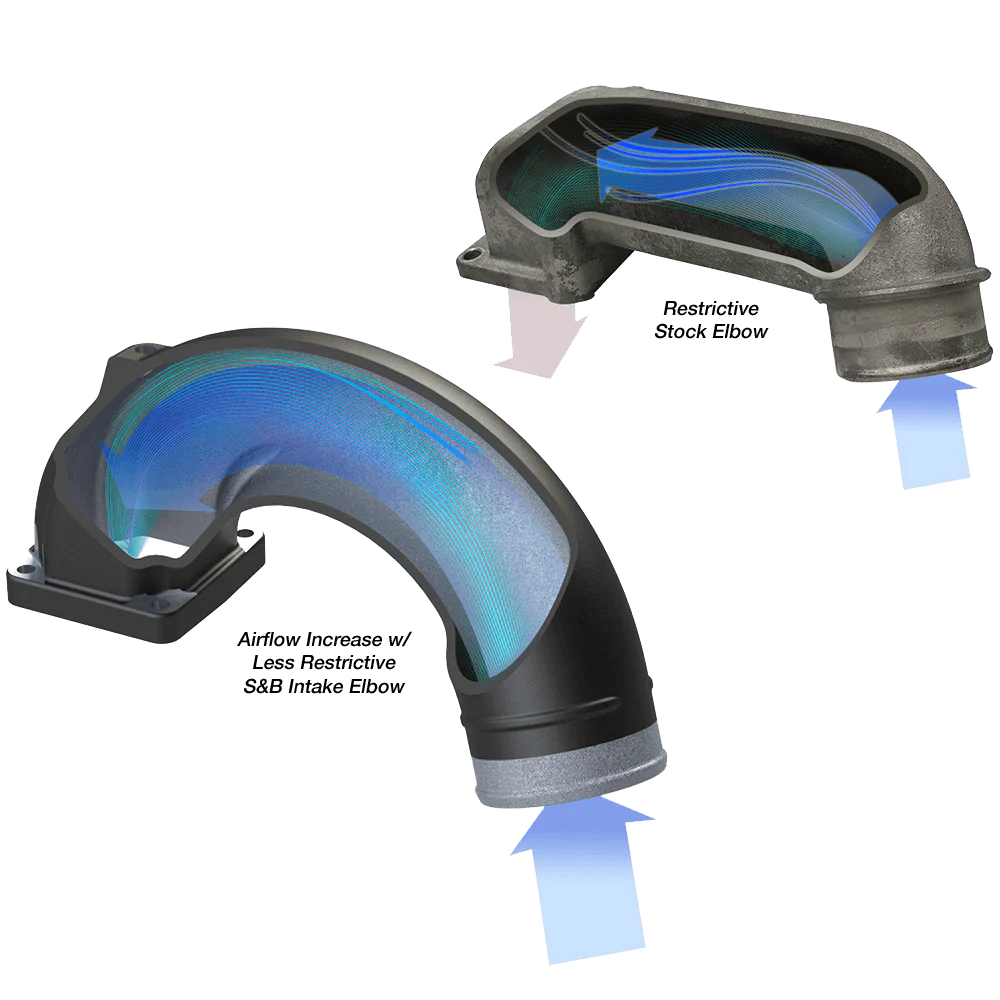 The S&B Elbow is huge compared to stock. The larger diameter makes room for more airflow, which results in even more power and performance.